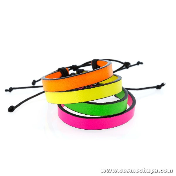 Pulsera ajustable hecha de polipiel. Cierre justable de hilo reforzado con acabado fluorescente.